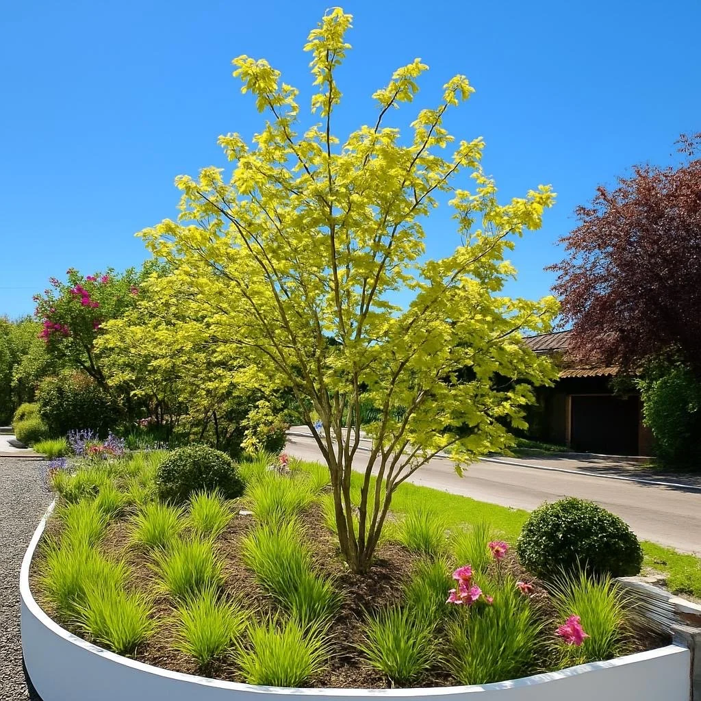 This front garden in Wheathampstead was planted to create a welcoming first impression with year-round interest. Structural multi-stem trees were introduced to add height, form, and a strong architectural presence, anchoring the planting scheme. The main bed features clipped topiary balls set within a softer, naturalistic mix of ornamental grasses and flowering perennials, bringing movement, texture, and seasonal colour. To the rear, a more structured arrangement uses evergreen forms as a backbone, interwoven with tulips to deliver a fresh burst of spring colour.